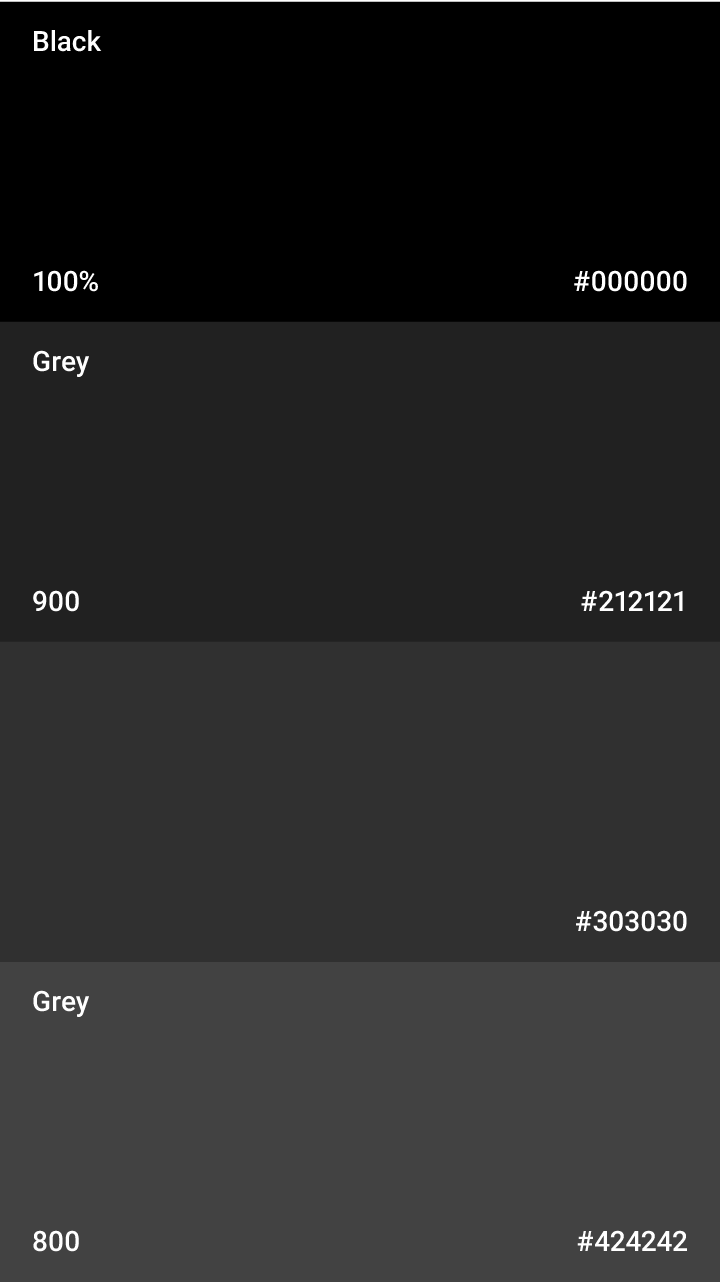 | Primary color (基色,原色) | 500 / 700 / 100 | 1. 屏幕中使用最广 2. 一般会配一个深色或浅色的色号colorPrimaryDark |
